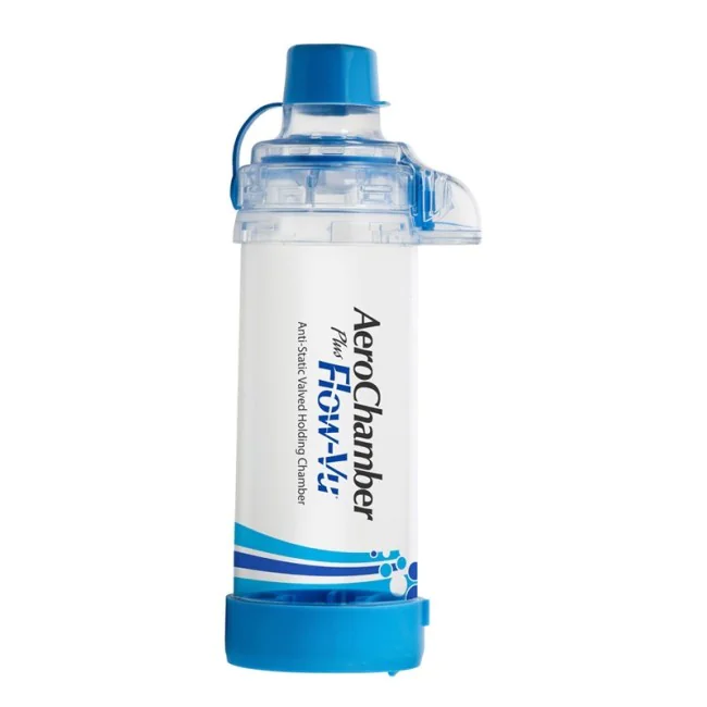 La camera distanziatrice antistatica AeroChamber Plus Flow-Vu è un dispositivo che consente una migliore assunzione di farmaci erogati tramite dispositivi MDI. Aerochamber è compatibile con tutti i principali modelli di MDI disponibili in commercio. La funzione antistatica impedisce alle particelle aerosolizzate di aderire alle pareti e il sistema Flow-Vu fornisce un feedback visivo al paziente durante tutta la fase inspiratoria. Il prodotto è offerto in diversi modelli con boccaglio e maschera sia per paziente adulto che paziente pediatrico. Periodo di garanzia: 6 mesi.