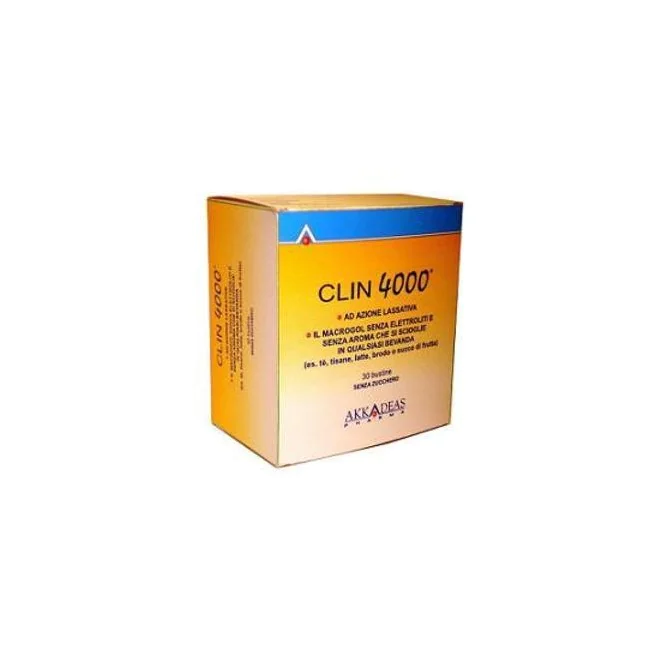 Dispositivo medico classe IIa. Clin 4000 svolge la sua azione in modo naturale; non viene assorbito né fermenta nell'intestino, non irrita la mucosa e viene eliminato nelle feci in forma non modificata. Lassativo in polvere per soluzione orale a base di Macrogol 4000. È particolarmente indicato nella stitichezza cronica; è ugualmente indicato nel caso di intestino occasionalmente irregolare. Grazie alla sua affinità per l'acqua, ammorbidisce le feci facilitando l'evacuazione. In questo modo favorisce un senso di benessere e sollievo. Non provoca né crampi, né dolore addominale, né condizioni di urgenza. La sua efficacia non si riduce nel tempo.