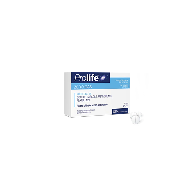 Dispositivo medico indicato in caso di flatulenza, gonfiore e crampi addominali (coliche gassose) dovuti ad una eccessiva e anormale formazione di gas intestinale nell'adulto e nel bambino. Prolife zero gas si può utilizzare anche per l'eliminazione del gas in preparazione ad esami diagnostici dell'area addominale. Prolife Zero gas assunto dopo i pasti principali protegge da coliche gassose, meteorismo e flatulenza. Il simeticone, attraverso un’azione puramente meccanica, diminuisce la tensione superficiale del gas intrappolato nel tratto gastroenterico, trasformandolo in gas libero che viene facilmente assorbito dalle pareti dell’intestino ed eliminato. La sua forma in compresse masticabili rende l’assunzione del prodotto pratica.