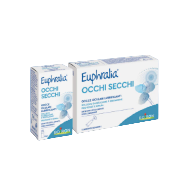 Euphralia OCCHI SECCHI gocce oculari lubrificanti è indicato in caso di occhio secco o irritato. Il sodio ialuronato contenuto nella soluzione conferisce al prodotto proprietà mucomimetiche e viscoelastiche in modo da garantire un’adeguata lubrificazione della superficie oculare, proteggendola dall’attrito generato dai movimenti oculari. Per questa ragione, lenisce gli occhi secchi e irritati. Inoltre, il polimero è in grado di trattenere l’acqua e contemporaneamente interagire con l’epitelio oculare. Per questo motivo, la soluzione è in grado di mantenere la superficie oculare umidificata, rinfresca gli occhi secchi e irritati e aumenta la stabilità del film lacrimale, proteggendo la mucosa oculare dagli agenti esterni. La formula contiene anche: acque distillate di Ginkgo biloba, Centella asiatica, mirtillo e finocchio per assicurare un’azione idratante, sodio cloruro e un sistema tampone (acido borico e sodio tetraborato decaidrato) per garantire una soluzione fisiologica.